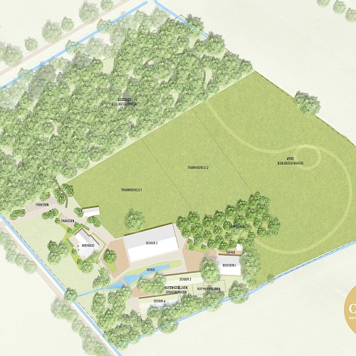 Voor de terreininrichting rondom de gebouwen maakten wij het masterplan. Net als bij de inrichting van de kennels staat bij de inrichting van de verschillende buitenverblijven het welzijn van de honden voorop. Buitenspelen en rondsnuffelen is belangrijk voor honden. In de buitenruimtes, trainingsvelden en wandelroutes is dan ook veel variatie aangebracht met verschillende materialen en diverse beplanting.