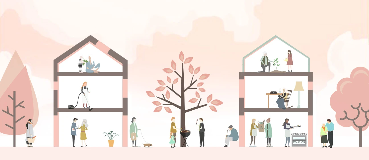 iCAREnext ontwikkelde acht bouwstenen voor een inclusieve (woon)omgeving. Deze zorgen voor samenhang tussen het sociale, ruimtelijke en technologische domein. Het resultaat is een woonomgeving waarin wijkbewoners, met en zonder ondersteuningsvraag, met elkaar verbonden worden. Gemeenschappelijke faciliteiten zoals gemaksdiensten hebben een centrale plek in de wijk gericht op ontmoeting, verbinding en peer support. Professionele zorg en ondersteuning wordt vanuit de wijk georganiseerd door hulpverleners en ervaringsdeskundigen. De bewoners worden betrokken bij de transformatie naar zo’n nieuwe woonomgeving. Zij hebben een actieve rol in het ondersteunen van elkaar vanuit hun eigen kracht, vaardigheden en talenten, eventueel met hulp van een (professionele) coach.