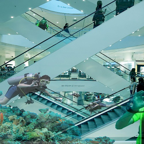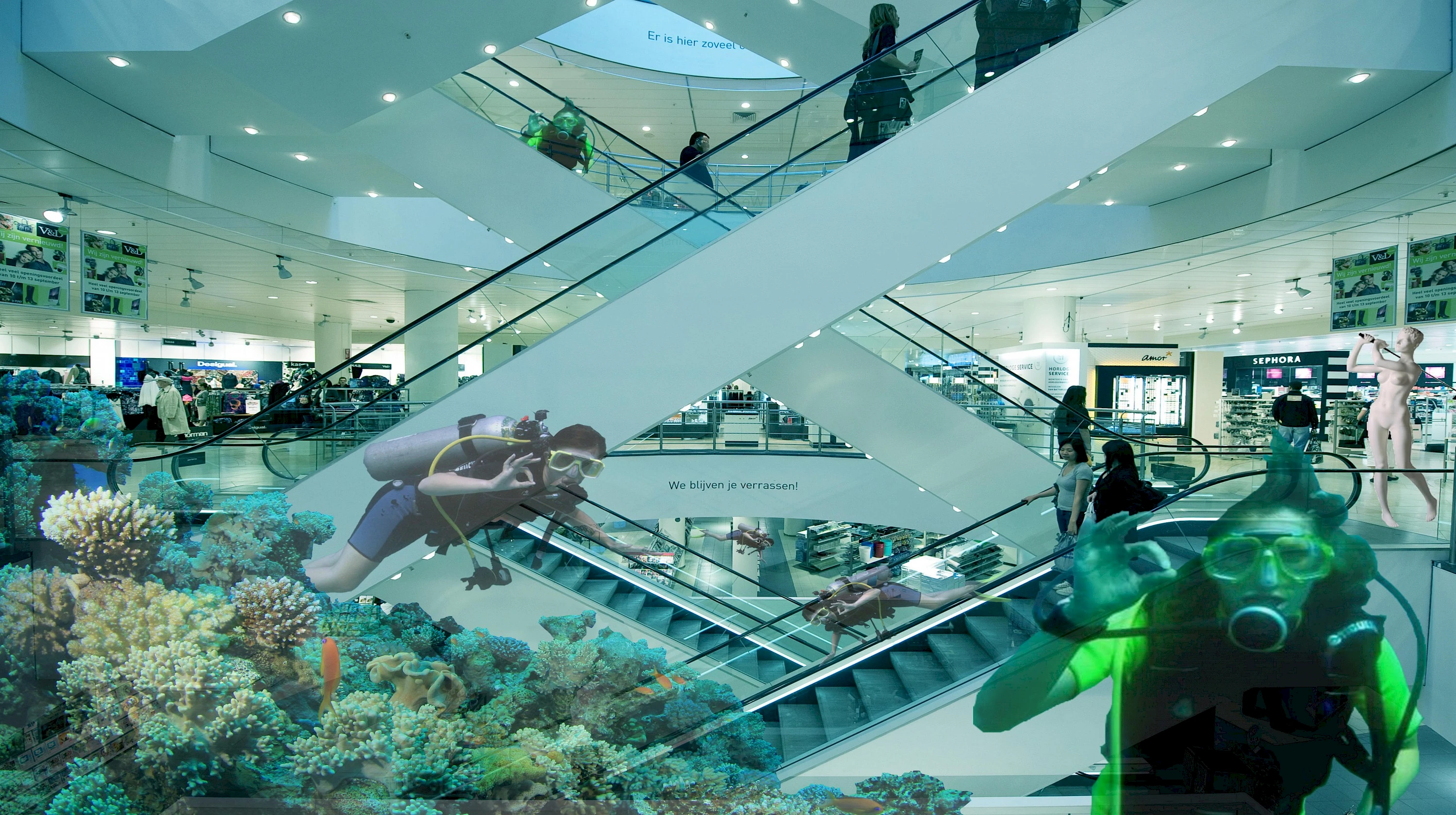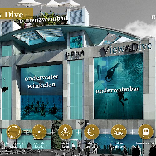 Hoe wij dit vertalen naar de Rotterdamse binnenstad? Maak van de Hudson’s Bay op de kop van de koopgoot een nieuw icoon van internationale allure: een indoor duikcentrum. In een groot bassin wordt een onderwaterwereld gecreëerd. Een optimale omgeving om op spectaculaire wijze de duiksport te beoefenen. De grote glazen puien van het pand bieden het winkelende publiek een uniek en fantastisch inkijkje in de onderwaterwereld en de kunst van het duiken. De verlengde koopgoot, een glazen onderdoorgang dóór de duikbassins, versterkt die beleving. We noemen het de View&Dive. Als nostalgische knipoog naar de door veel mensen geliefde en gemiste Vroom & Dreesman.