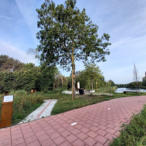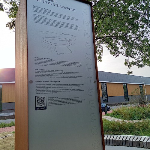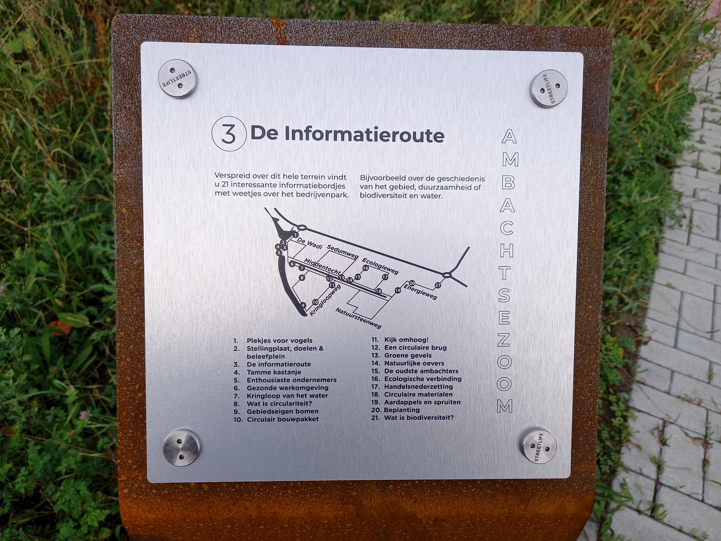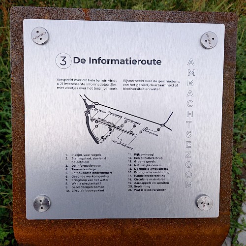 De informatieborden vertellen het complete verhaal van Ambachtsezoom; over het circulaire en natuurinclusieve karakter van het bedrijvenpark, over de inheemse beplanting en waarom we daar voor kozen, over de vogels en dieren die je er kunt zien. Maar ook dat de bestrating biobased is en alle bedrijfspanden circulair en volledig demontabel zijn – en wat dat nou eigenlijk is, circulariteit en biodiversiteit.