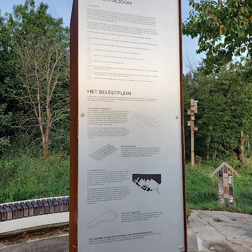 We plaatsten twintig informatieborden in het bedrijvenpark, langs een wandeling die je naar alle buitengewone plekken op Ambachtsezoom voert: naar de bomenkamers, de groene woonwerkruimtes, de wadi’s en de Middentocht, het groenblauwe hart van het bedrijvenpark.