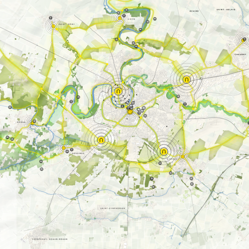 For Europan 16 we elaborated our vison for Niort, France. A city that is surrounded by a lush and diverse landscape, but which is largely underexposed and neglected. The main entrances to the city show an industrial or commercial scenery and there is a lack in qualitative connections between the landscape and the city. In our vision we propose a ‘Green Ribbon’ which strengthens the connection and experience between Niort, the villages, and the ecological and cultural landscape.