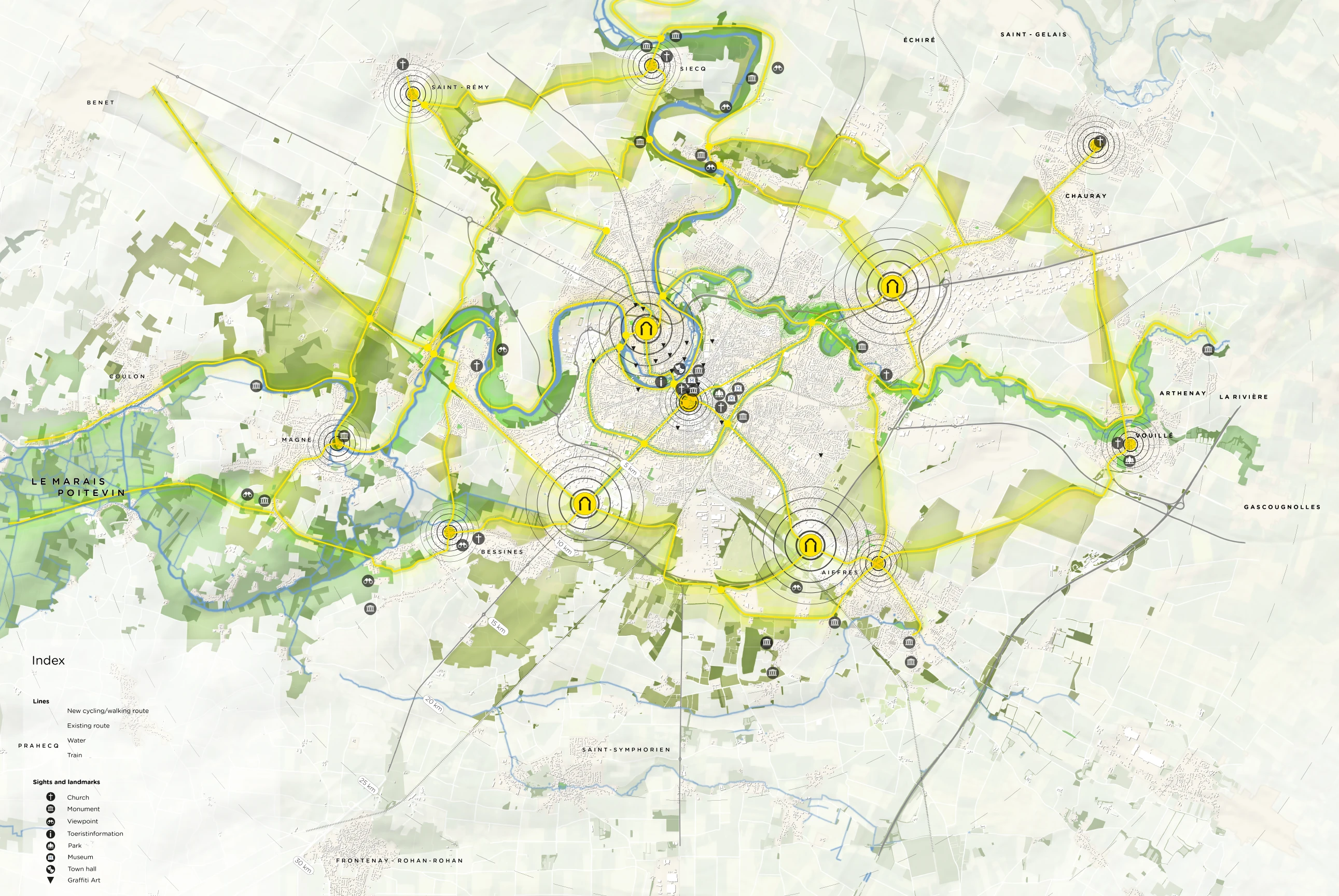 Le Ruban Vert / The Green Ribbon is a route network for cyclists and pedestrians that connects the urban with the rural, the rural with the urban. It interconnects the city of Niort with the villages and the villages with their neighbouring villages. It strengthens the experience of nature in the city and the landscape by creating a series of linked landscapes and landscape parks. Le Ruban Vert is a safe and recognisable network for pedestrians and cyclists only, which will invite people to go outside more often o experience their surrounding villages and landscapes.