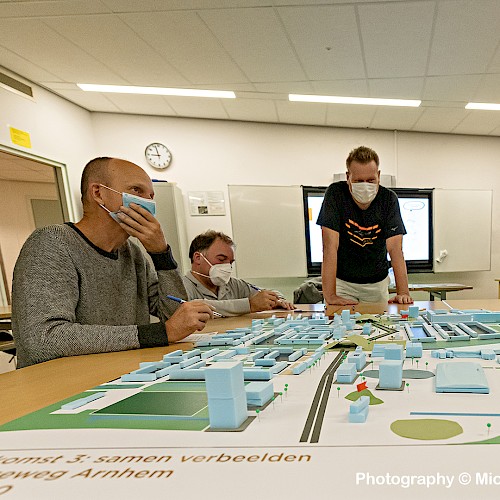 Dit deden we in drie aparte groepen. Elke groep ging met dezelfde opgave aan de slag, maar kreeg een ander hoofdidee mee voor de beleving van de Nijmeegseweg. Een groep ging aan de slag met de situatie zoals hij nu is; de Nijmeegseweg met een brede groene middenberm. De tweede groep kreeg als opdracht de Nijmeegseweg als stadsstraat te verbeelden, waarbij de rijbanen naar elkaar toe worden gebracht tot een smaller wegprofiel. De derde groep had als opdracht de weg als slinger een nieuwe positie in het gebied te geven, waarbij de middenberm smal danwel breed mocht zijn.