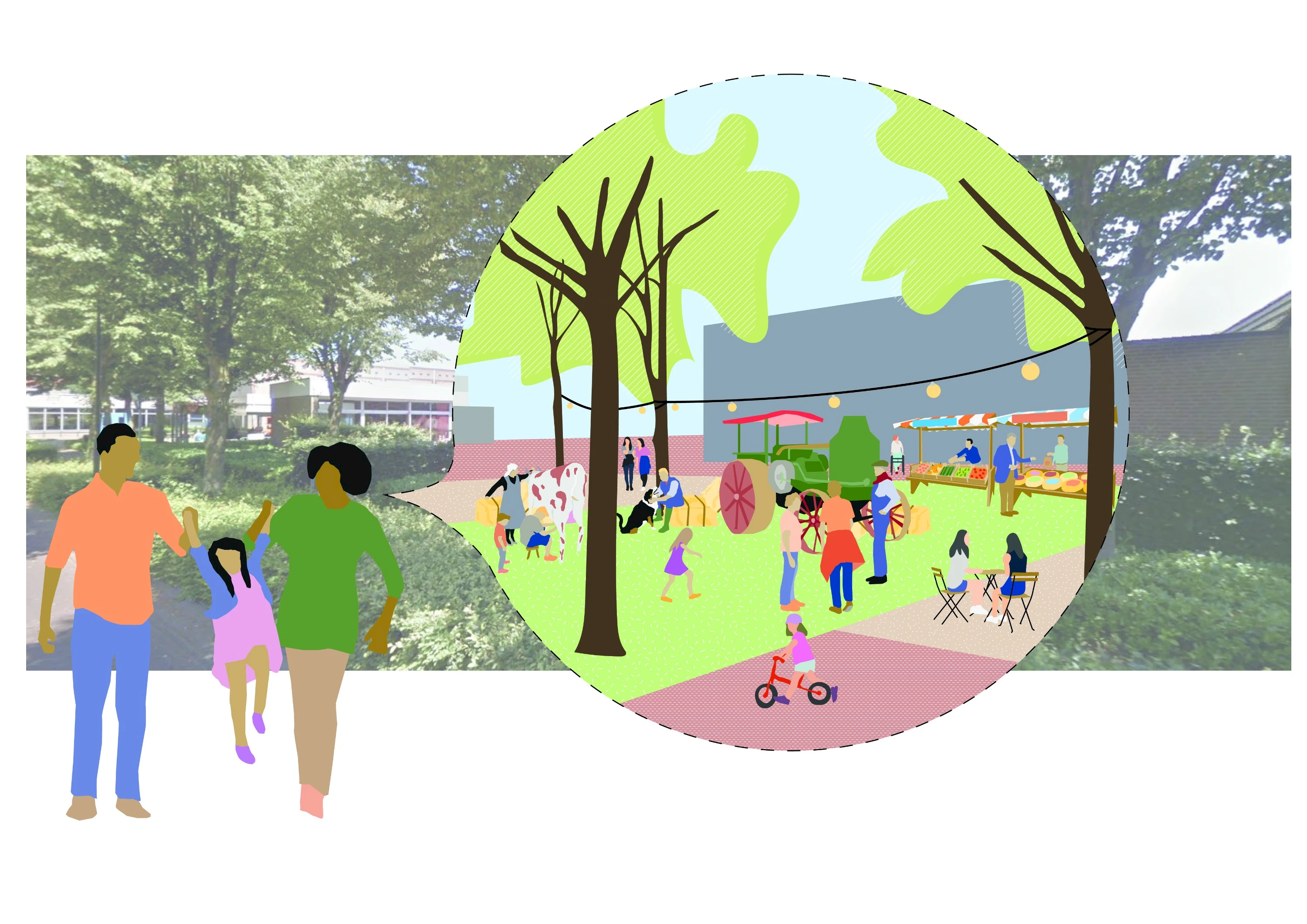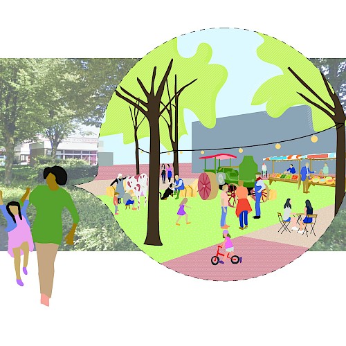 De derde pijler van ons voorstel, naast het Dorpsplein en de woningbouw is het blootleggen van een waardevol stelsel van groene openbare ruimtes. Graag verbinden wij daarvoor het centrum met het aanwezige 'Kasteelpark'. Zo willen wij de leefomgeving van Hapert een boost geven en een accent leggen op klimaatbestendigheid en het langzame verkeer. De auto nemen we serieus; gelijktijdig werken we toe naar een toekomst waarin deze niet meer dominant zal zijn.