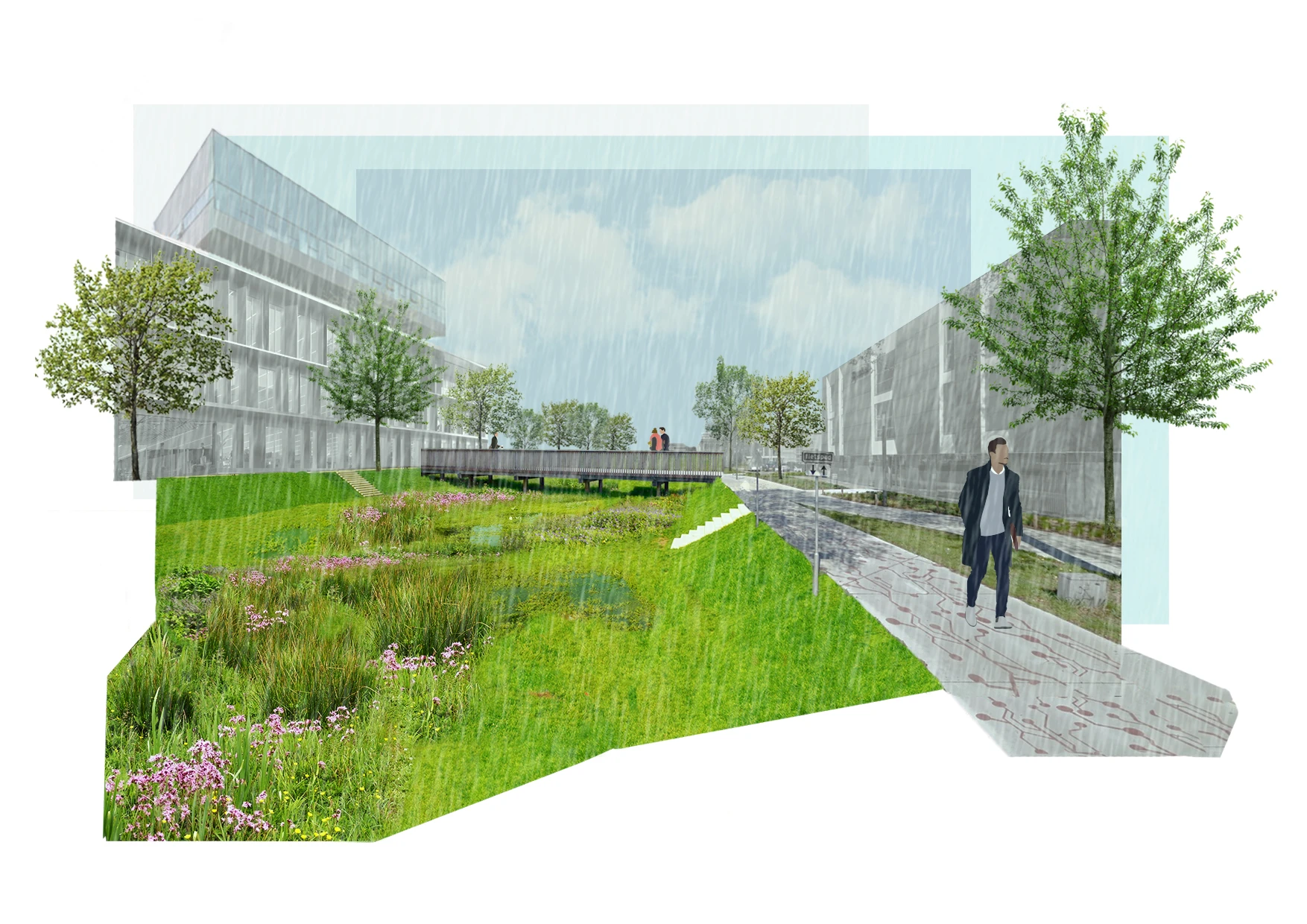 Ook de andere openbare ruimtes worden onderdeel van dit watersysteem door het dichte netwerk van mogelijkheden voor waterberging en infiltratie. Hierbij zijn het aangaan van een relatie met de omgeving en het meewerken met de topografie de basis. We creëren nieuwe maaiveldniveaus, waardoor het water langer kan worden vastgehouden, zodat het meer tijd krijgt om te infiltreren in de bodem. Verharding maakt plaats voor kwalitatieve groene ruimtes, zoals regentuinen, waterpleinen en wadi’s.