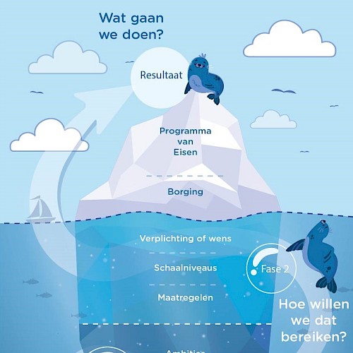 Daarvoor zetten we niet alleen onze eigen vakkennis is, maar maken we ook graag gebruik van de expertise die in het gebied aanwezig is. Bij de gemeente, toekomstige ondernemers op het terrein en andere stakeholders. Als geen ander kennen zij de omgeving. Gezamenlijk doorlopen we een interactief traject, dat in totaal vier maanden duurt. Voor het vormgeven van dit traject gebruiken we het beeld van een ijsberg als metafoor. Het uiteindelijke programma van eisen is immers maar het topje; onder water ligt er een solide basis van onderzoeken, gesprekken en weloverwogen keuzes onder. Die basis groeit in verschillende stappen, waarin elke nieuwe stap steeds voortbouwt op de vorige.